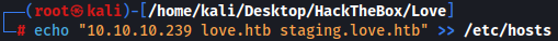echo "10.10.10.239 love.htb staging.love.htb" >> /etc/hosts