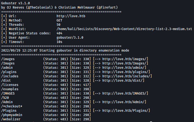 gobuster dir -u "http://love.htb" -w '/home/kali/SecLists/Discovery/Web-Content/directory-list-2.3-medium.txt' -t 50