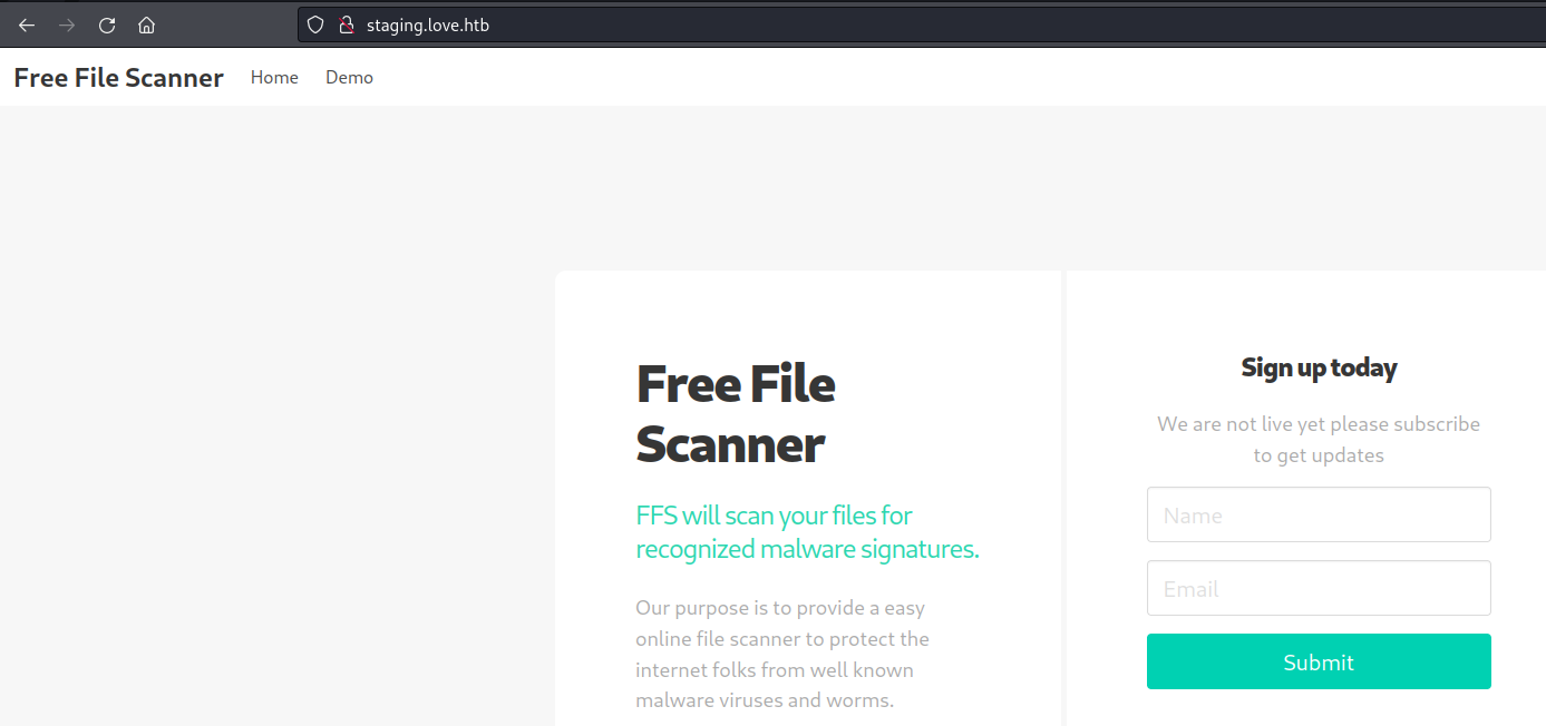 A continuación, podemos intentar navegar hacia `love.htb`y `staging.love.htb` en los puertos 80, 443 y 5000  para ver si esto da como resultado respuestas diferentes a las que vimos anteriormente. Al hacer esto, descubrimos un servicio de escaneo de archivos en [http://staging.love.htb](http://staging.love.htb/).&#x20;