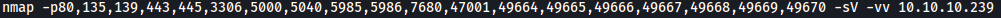 nmap -p80,135,139,443,445,3306,5000,5040,5985,5986,7680,47001,49664,49665,49666,49667,49668,49669,49670 -sV -vv 10.10.10.239