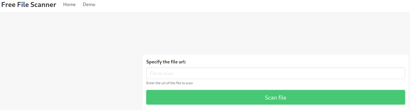 El botón `Home` lleva a la página actual mientras que el botón `Demo` lleva a la página de abajo. Esta página se puede usar para escanear archivos en Internet al hacer referencia a ellos con una URL.