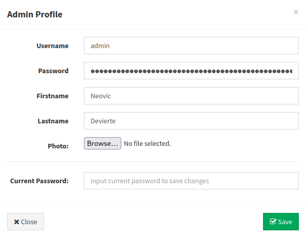 Al hacer clic, aparece un formulario para actualizar el perfil de administrador.