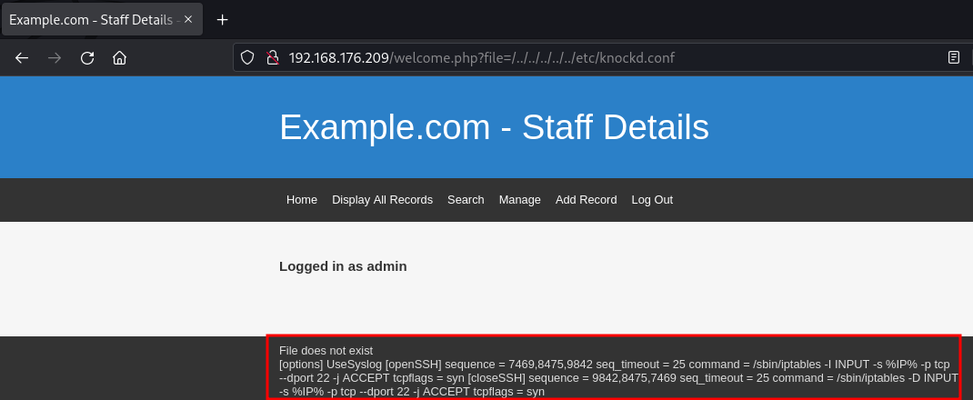 Básicamente, todos los usuarios que vimos anteriormente tienen acceso a la máquina y las contraseñas que obtuvimos podrían permitirnos ingresar a la máquina, pero del informe nmap sabemos que el puerto SSH está siendo filtrado, esto podría significar que está restringido por IP tal vez o estamos lidiando con un "port knocking". Aprovechando el LFI, intentamos leer un archivo knockd.conf si estaba disponible y pudimos obtener información de dicho archivo.