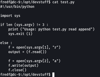 Nos dirigimos juntos a la ubicación donde observamos que se encuentra almacenada el archivo test.py. Al examinarlo con más atención, nos damos cuenta de que se trata de un programa sencillo para añadir datos. Aceptará dos archivos como parámetros y luego agregará el contenido del primer archivo dentro del segundo archivo.