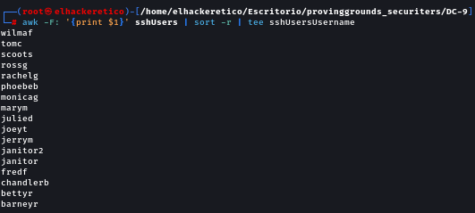 awk -F: '{print $1}' sshUsers | sort -r | tee sshUsersUsername