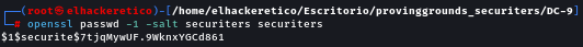 Crearemos un nuevo usuario con acceso de root y añadiremos la entrada del usuario en el archivo /etc/passwd utilizando el script test.py. Crearemos un usuario y su hash de contraseña. Llevaremos a cabo esta tarea usando openssl. Aquí, crearemos un usuario llamado securiters con la contraseña securiters. Una vez obtenido nuestro hash, pasaremos a la máquina objetivo.