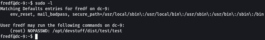 Una vez que hayamos iniciado sesión como fredf, podemos verificar si tiene algún permiso de sudo usando el comando `sudo -l`.