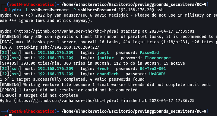 Encontramos nuevas contraseñas. Vamos a añadirlas al archivo de passwords que generamos anteriormente y volvemos  a ejecutar hydra.