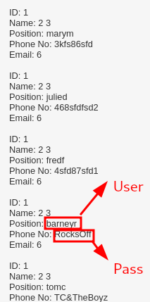 Copiamos esta línea en un documento de texto, y extraemos de ella una lista de nombre de usuarios y otra de contraseñas.