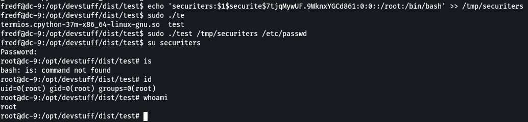 Añadimos el nombre de usuario, seguido de dos puntos (:) y ":0:0::" para crear una entrada que podría funcionar como usuario "root". Luego, empleamos el comando echo para generar un archivo llamado "securiters" en el directorio /tmp. Posteriormente, utilizamos el script test.py que descubrimos antes con el archivo "securiters" e incluimos el hash del usuario que acabamos de crear dentro del archivo /etc/passwd. Después de eso, iniciamos sesión como el usuario securiters que hemos creado. Ingresamos la contraseña y obtenemos acceso de root en la máquina.