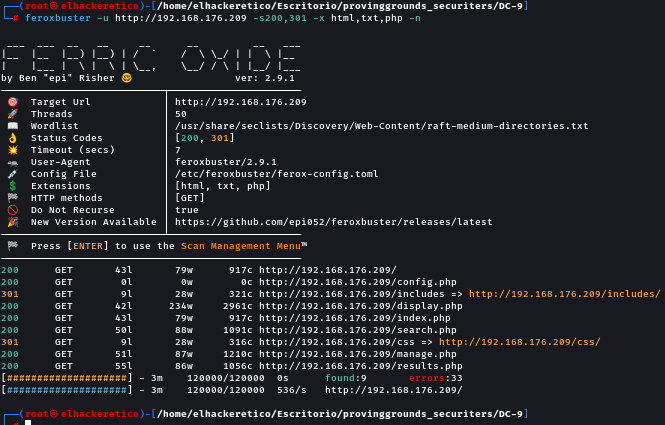 <pre><code><strong>feroxbuster -u http://192.168.176.209 -s200,301 -x html,txt,php -n