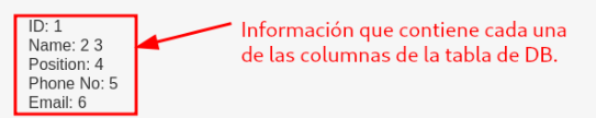 Incrementando el número en uno, observamos que al ejecutar "ORDER BY 7", deja de mostrarse información, lo que indica que el total de columnas es 6. Nuestro próximo objetivo es determinar en qué parte se muestra la información de cada columna. Por lo tanto, introduciremos algunos números para reconocer cada columna, y esto se puede llevar a cabo a través de la siguiente consulta: