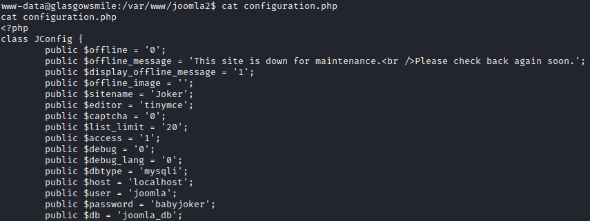 Tenemos la capacidad de acceder al directorio de Joomla. La cuenta de servicio utilizada es "www-data". Nuestro objetivo principal es verificar qué archivos de configuración podemos acceder para obtener un mayor nivel de acceso. Al ejecutar el comando "ls", encontramos el archivo "configuration.php", el cual contiene la información de la base de datos. Procederemos a guardar esta información.