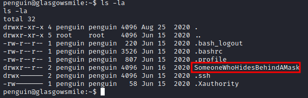 Dentro del directorio /SomeoneWhoHidesBehindAMask encontramos el archivo PeopleAreStartingToNotice.txt.&#x20;
